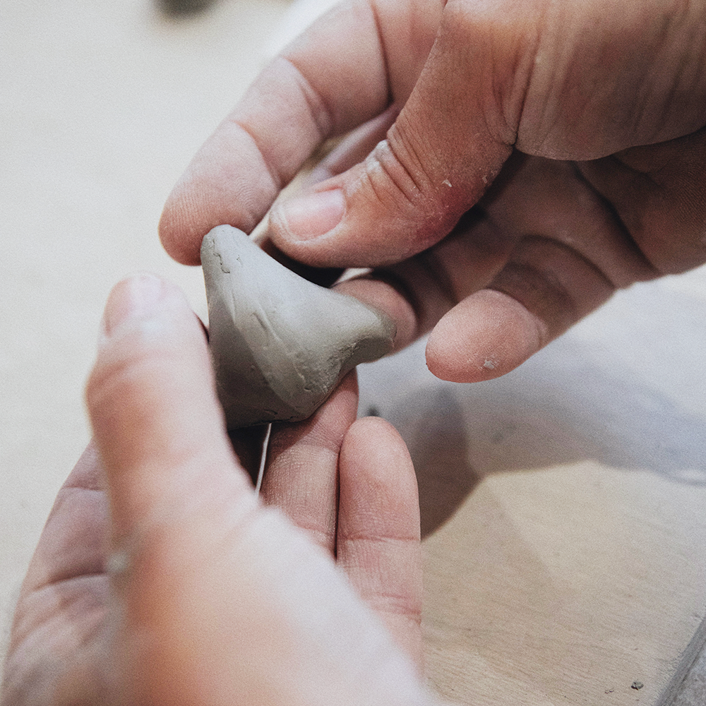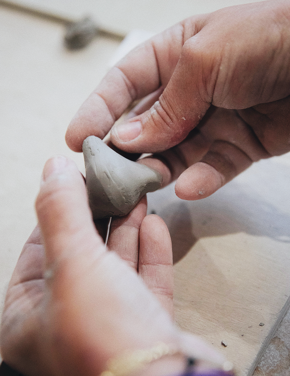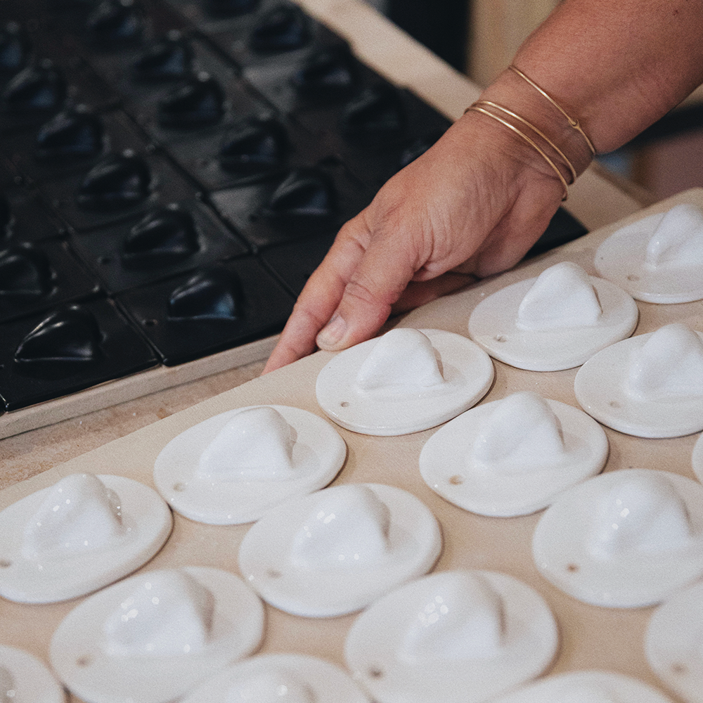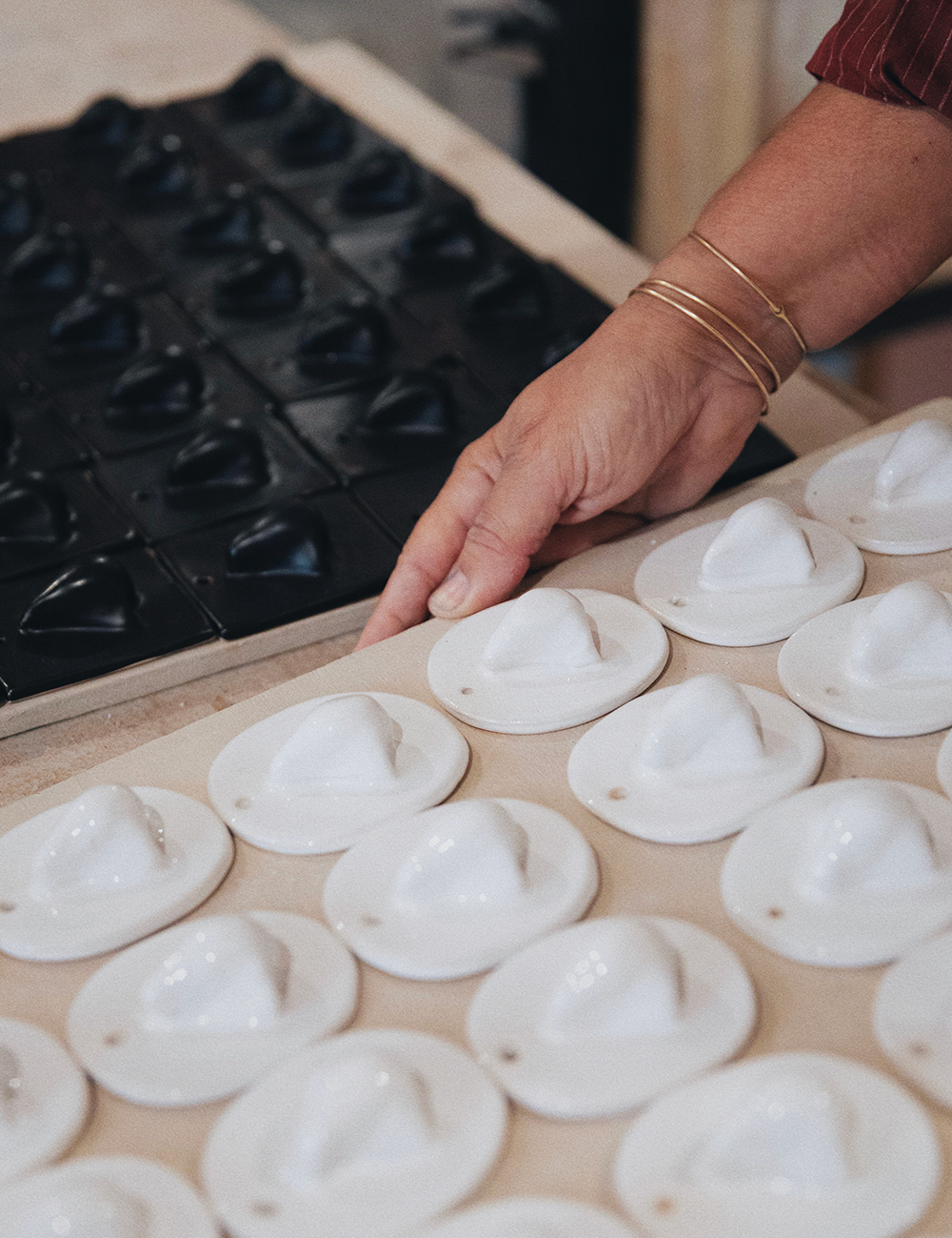 Du modelage de la pièce, aux emporte-pièces, à la première cuisson, jusqu’au parachèvement avec les feuilles d’or, un temps long et précieux.